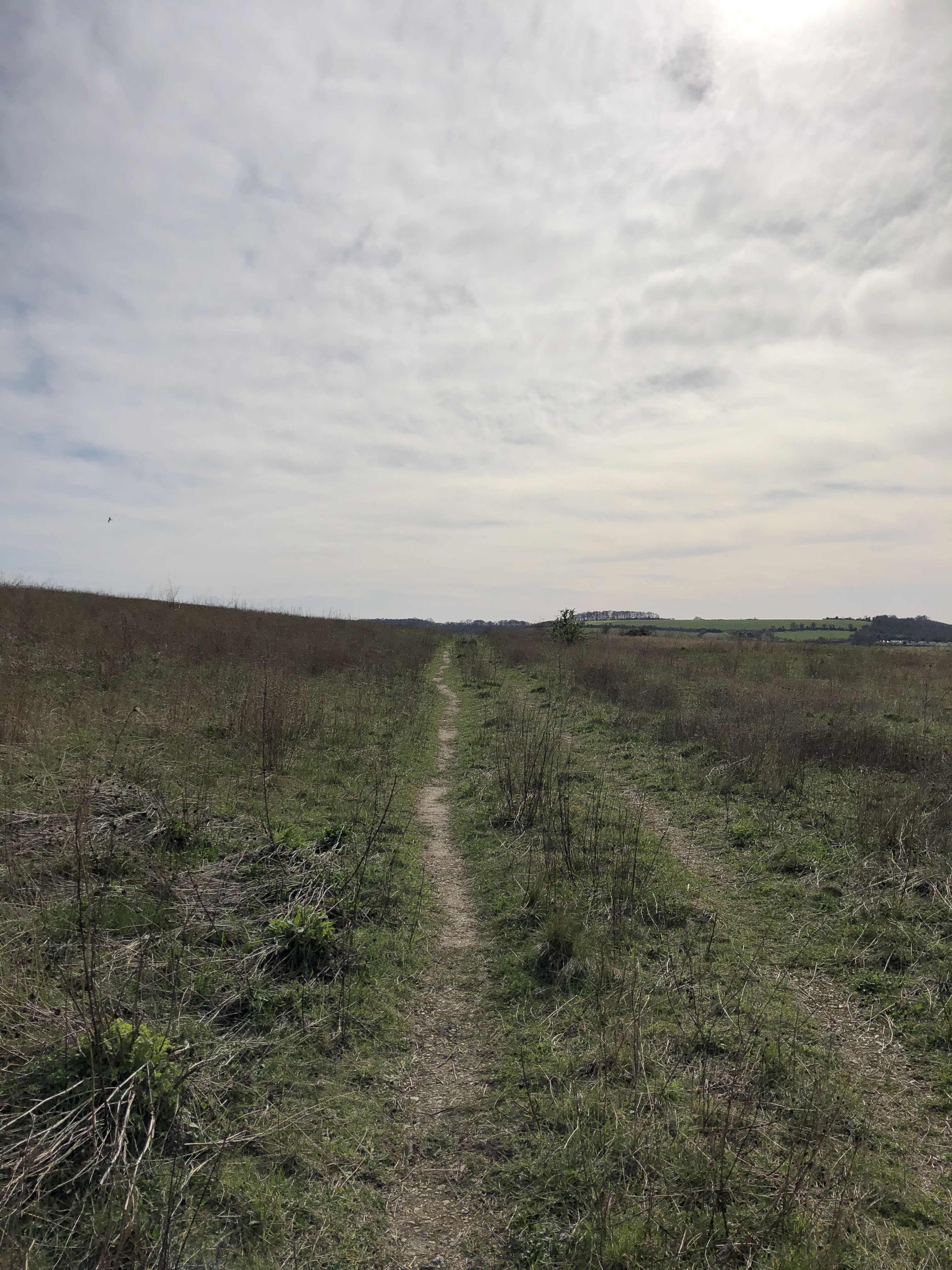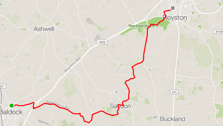 The Class 700 to Baldock is empty. Sunlight flashes on the blue hand-holds attached to each seat designed for passengers to hold on to when they must stand. 3 people get on at Baldock and I get off. I decide to take the “top” route to the hills towards the chalk escarpment of Therfield Heath.