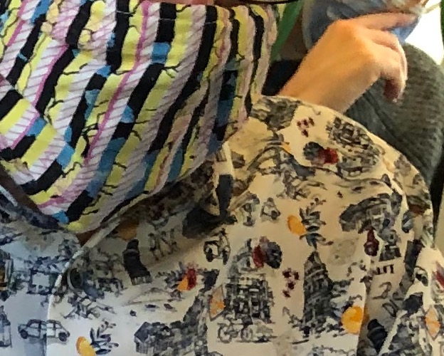 This is a well-behaved train-set of passengers. A man with a colourful Amalfi coast themed shirt and a matching mask types noisily.