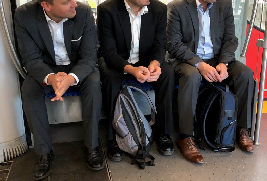 Three men sit opposite me, I think they may be bound for Innotrans as well. They seem to be seated in age order from left to right. The ‘middleman’ wears a mask. The oldest of them has the best bag. It looks comfortable to wear, featuring back support: wisdom with age? He browses his phone.