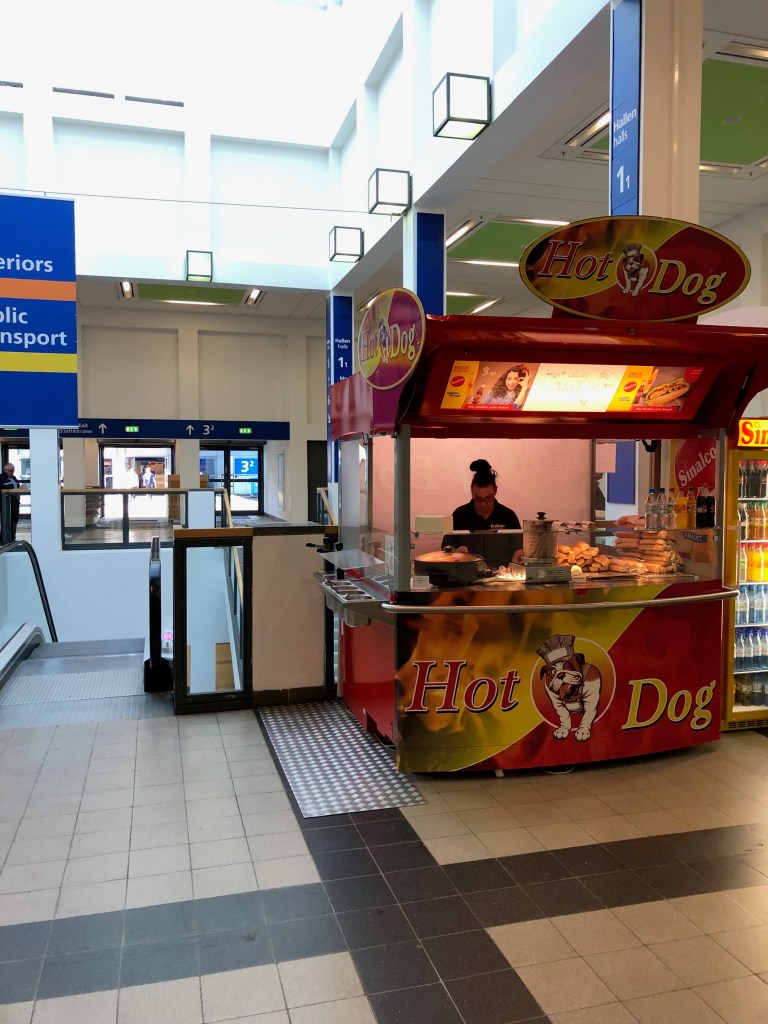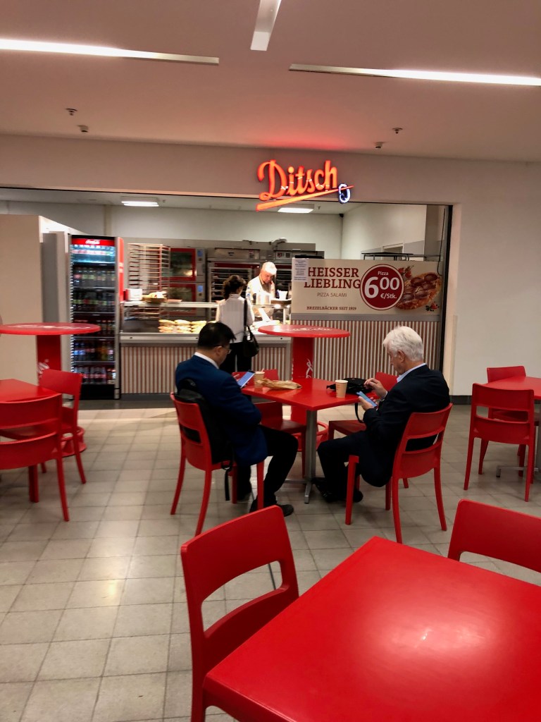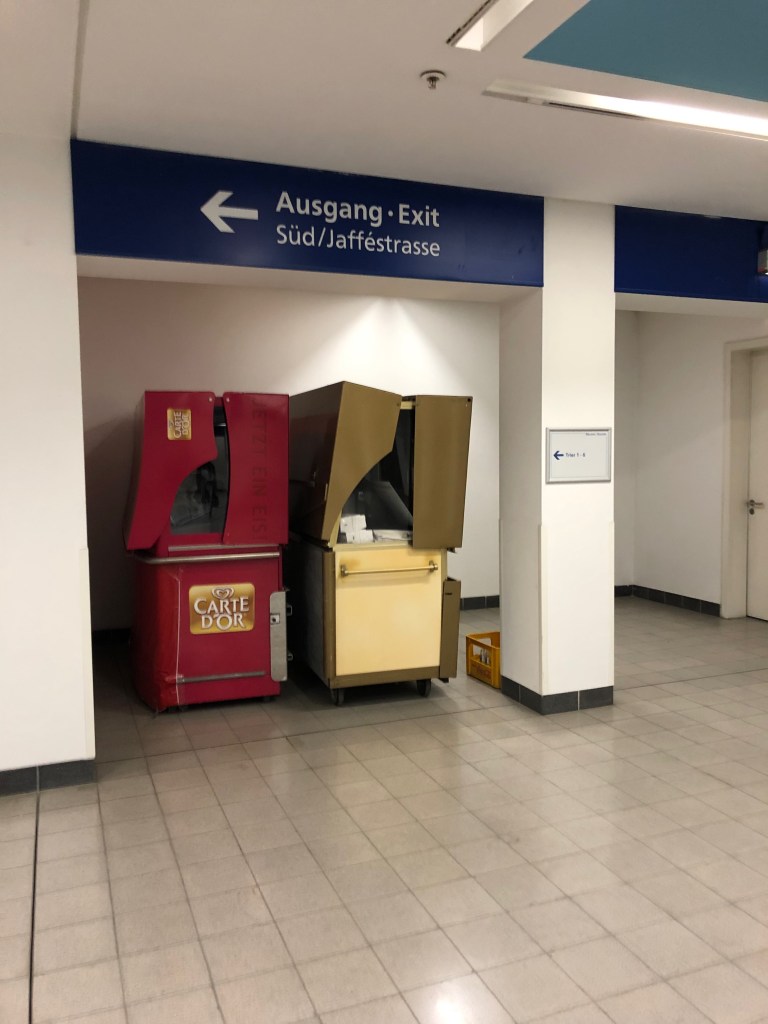 All the places have city names, I walk past a staff room, Trier 3. More food. Two lonely ice cream machines. A cleaning lady sitting on a bench with pink gloves. A hot dog stand.